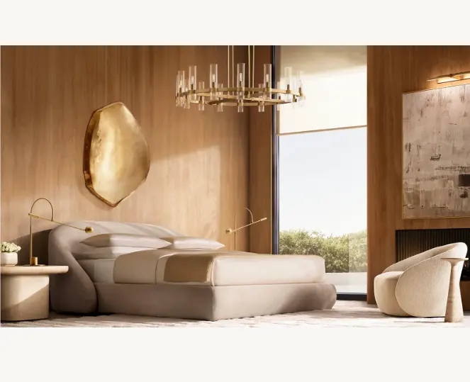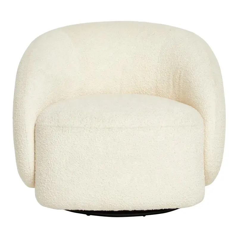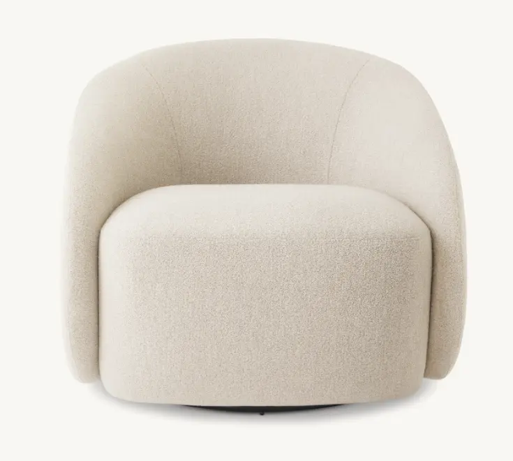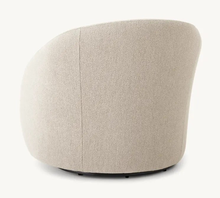 The sheltering back flows seamlessly into waterfall arms, forming a bold, biomorphic shape that evokes the sculptural silhouettes of Italian Postmodern design. The recessed swivel base creates a subtle shadow line.