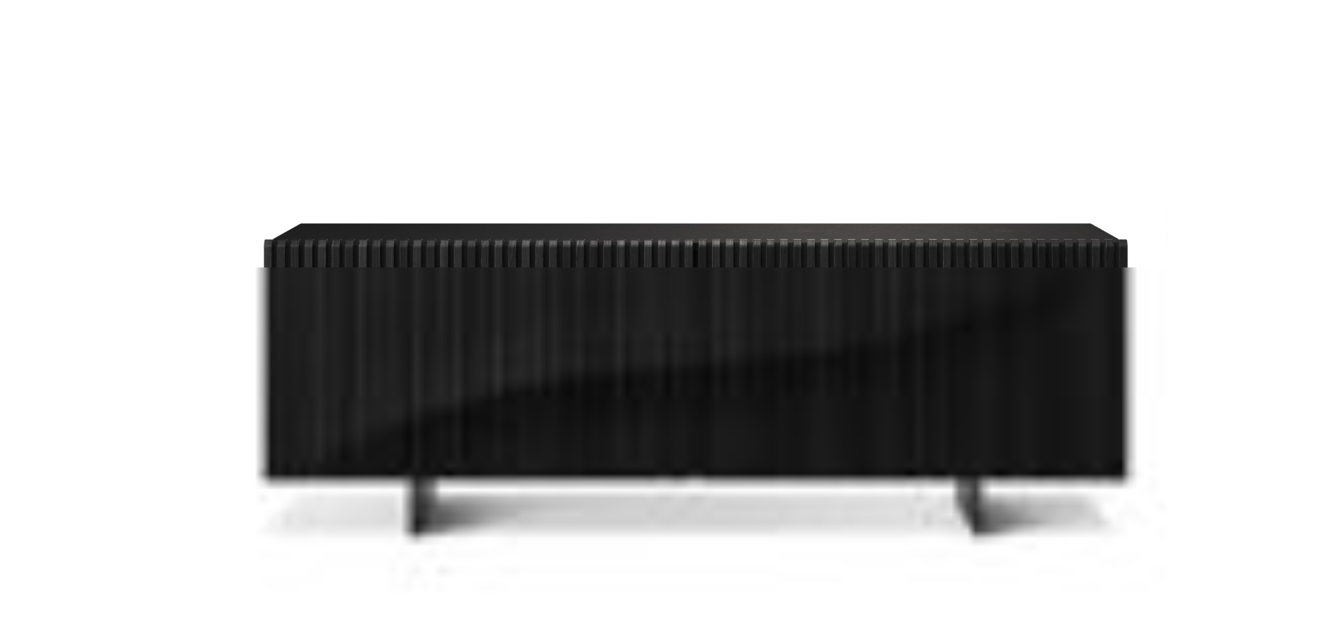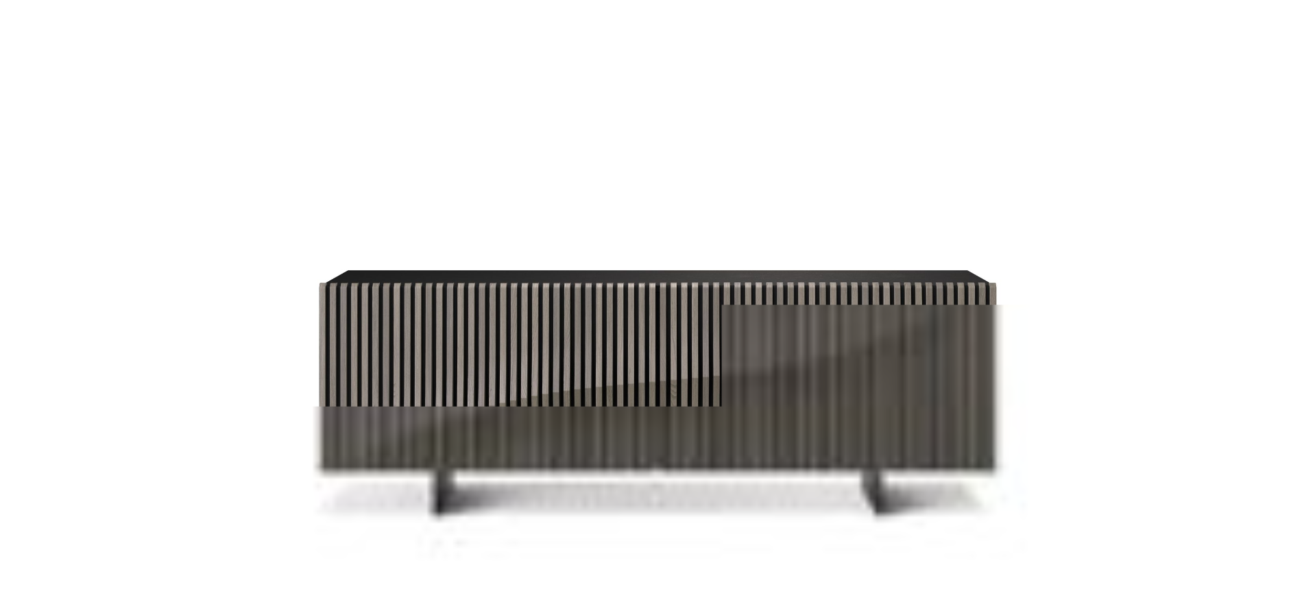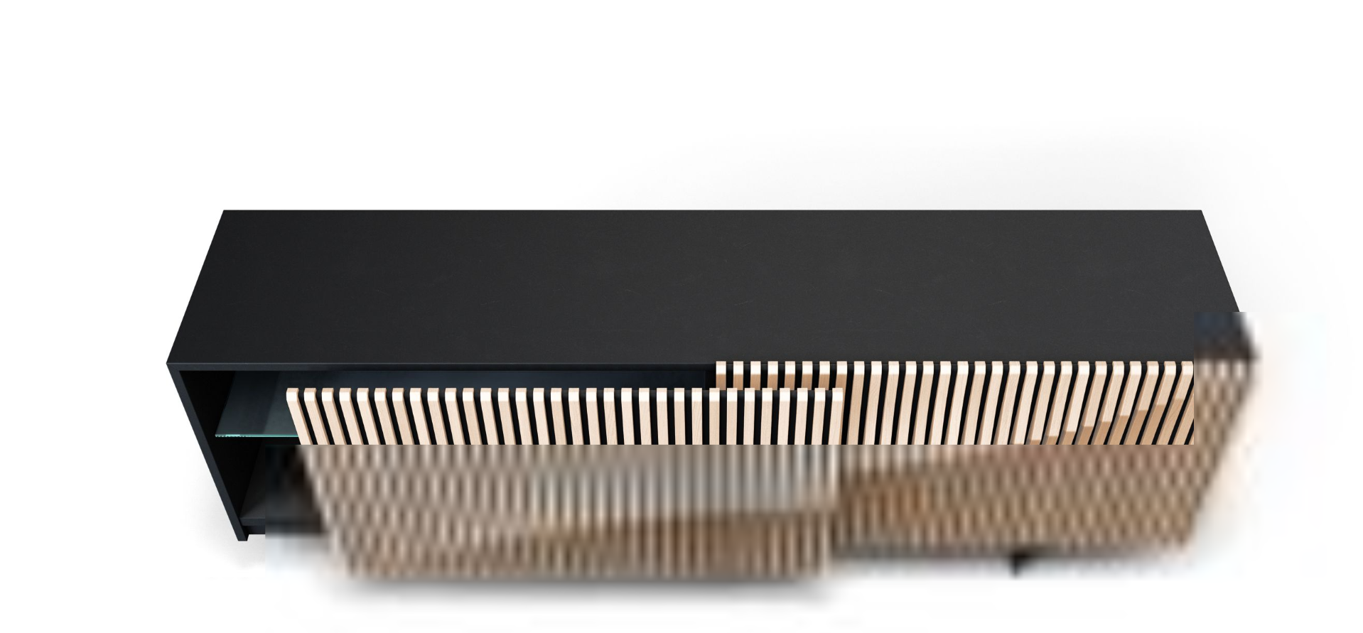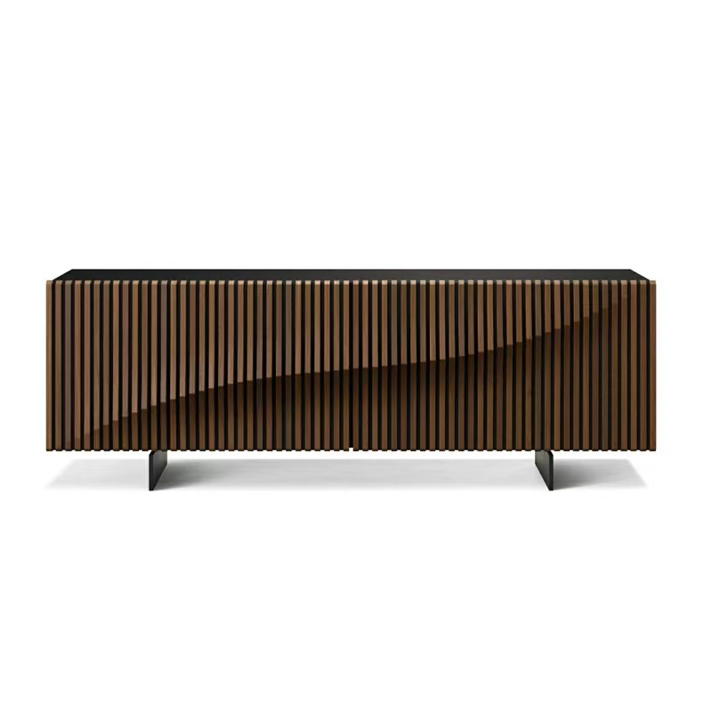 Sideboard with a structure made of Black lacquered medium-density fiberboard, featuring 2 coplanar sliding doors with a raised design crafted from oiled solid oak slats (4 shades). It includes an interior drawer and a tempered glass shelf (8mm thick). The base is made of epoxy-coated steel.
