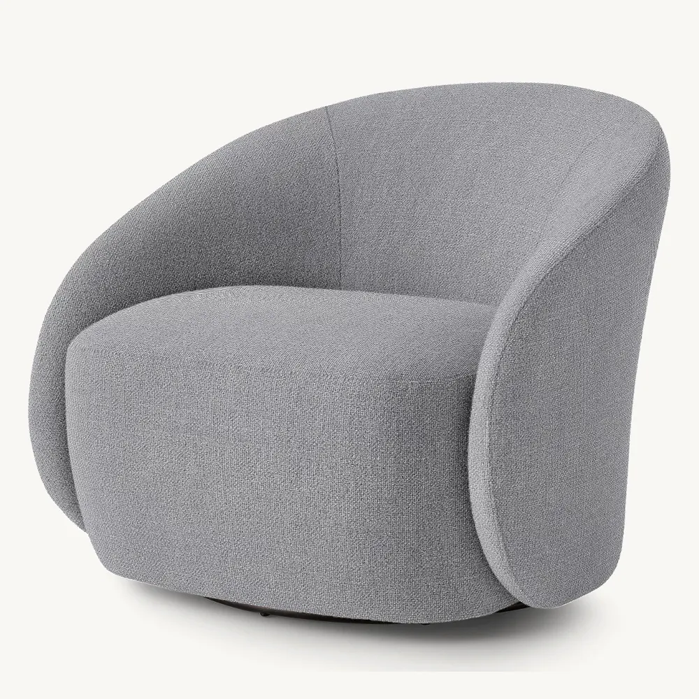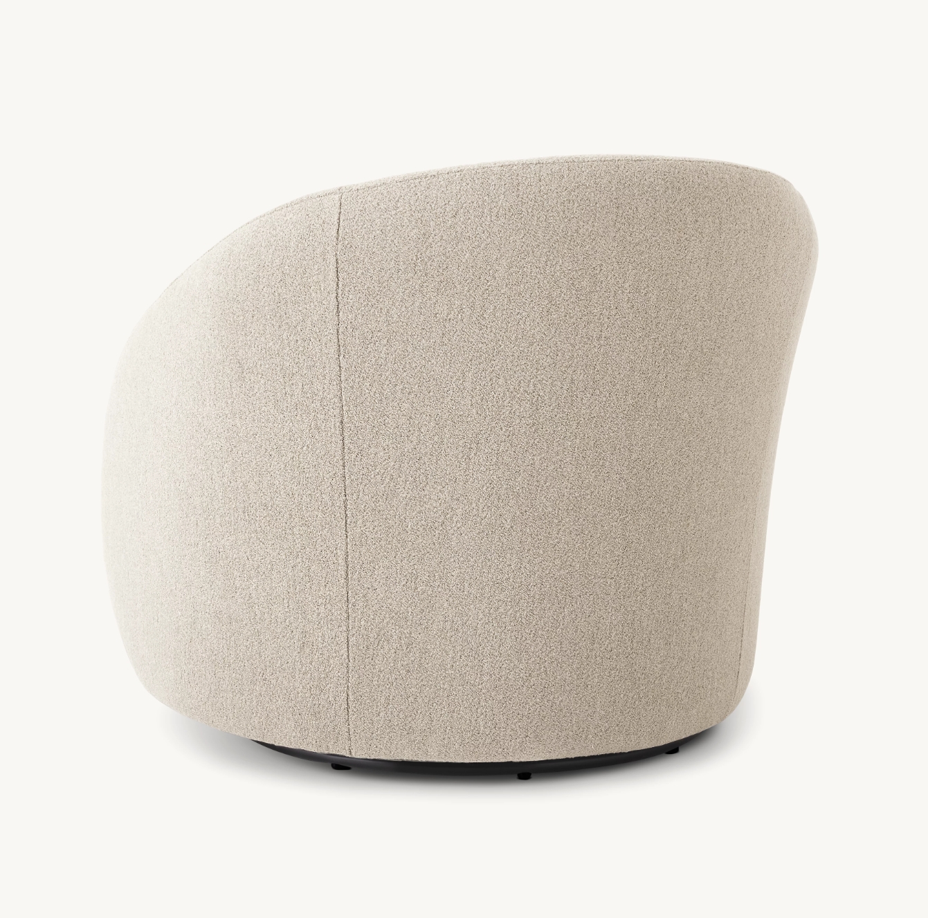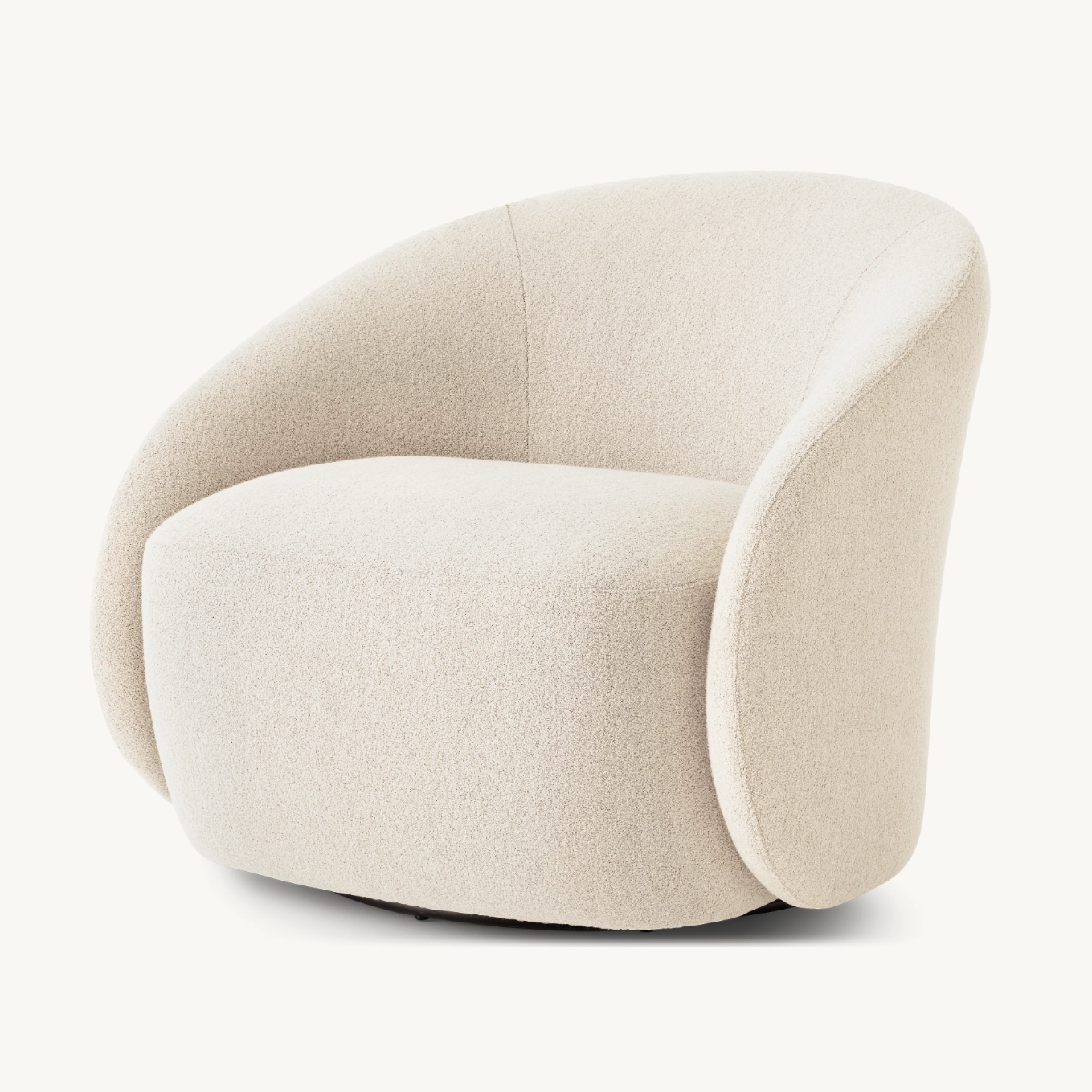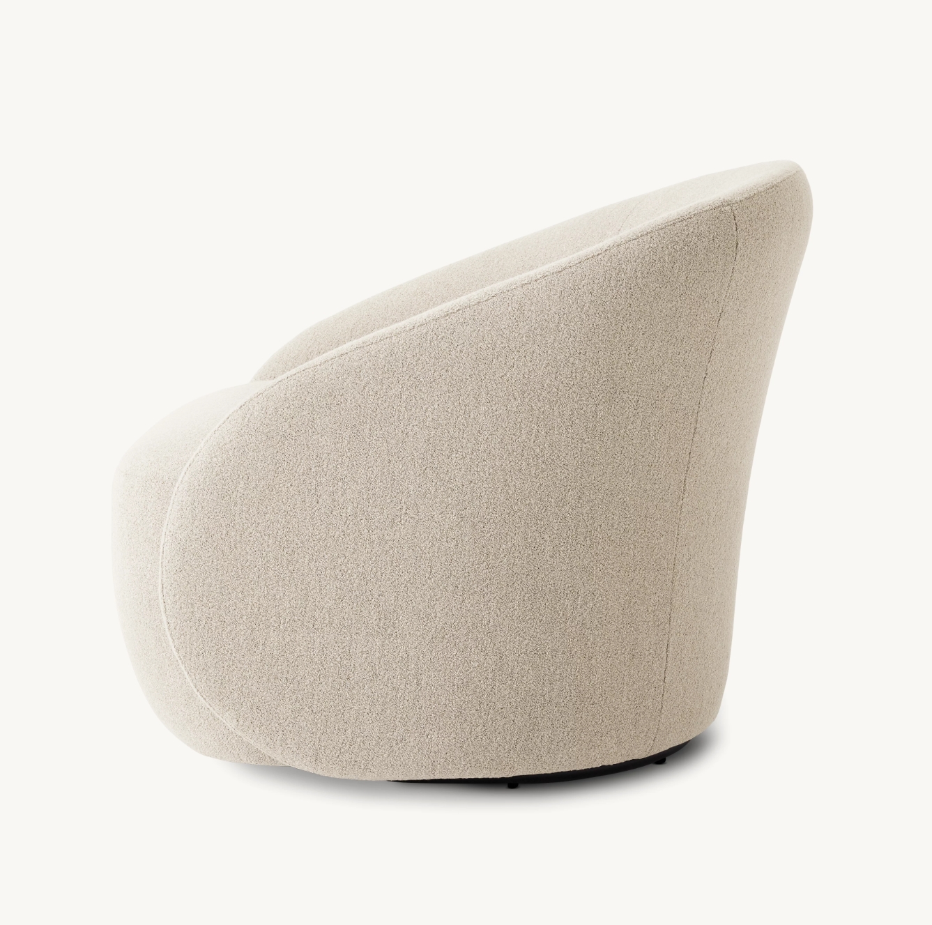The sheltering back flows seamlessly into waterfall arms, forming a bold, biomorphic shape that evokes the sculptural silhouettes of Italian Postmodern design. The recessed swivel base creates a subtle shadow line.