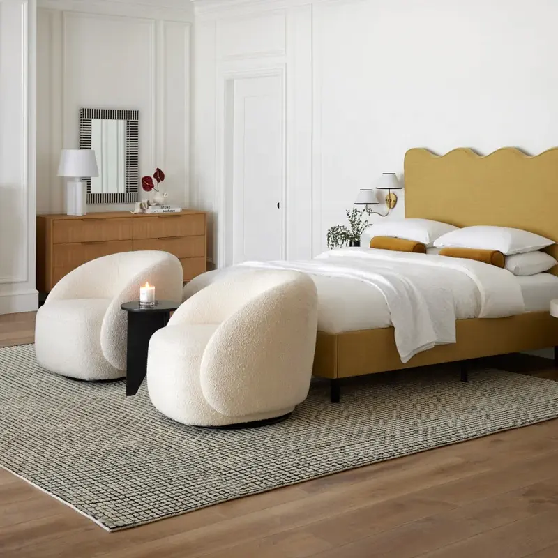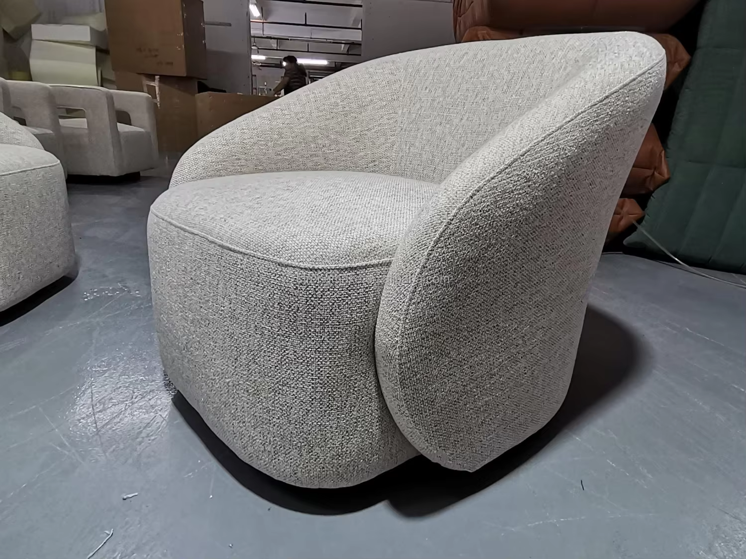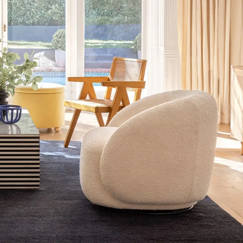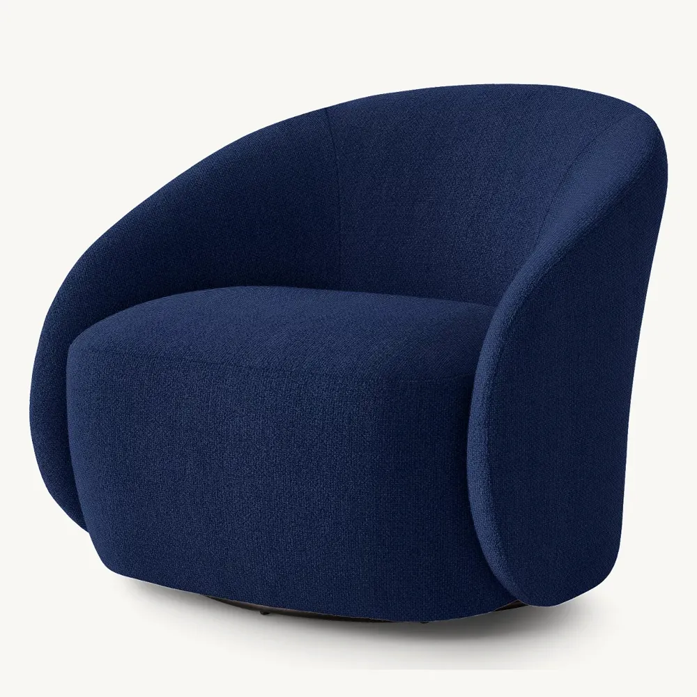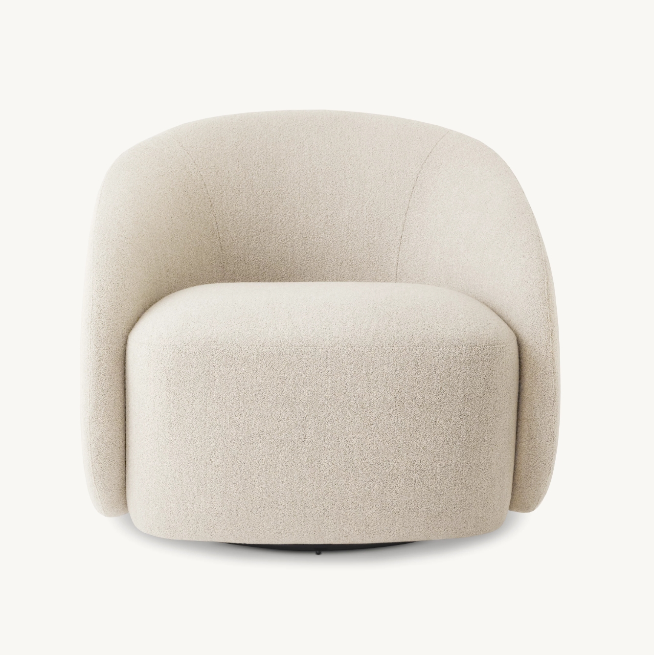 The sheltering back flows seamlessly into waterfall arms, forming a bold, biomorphic shape that evokes the sculptural silhouettes of Italian Postmodern design. The recessed swivel base creates a subtle shadow line.